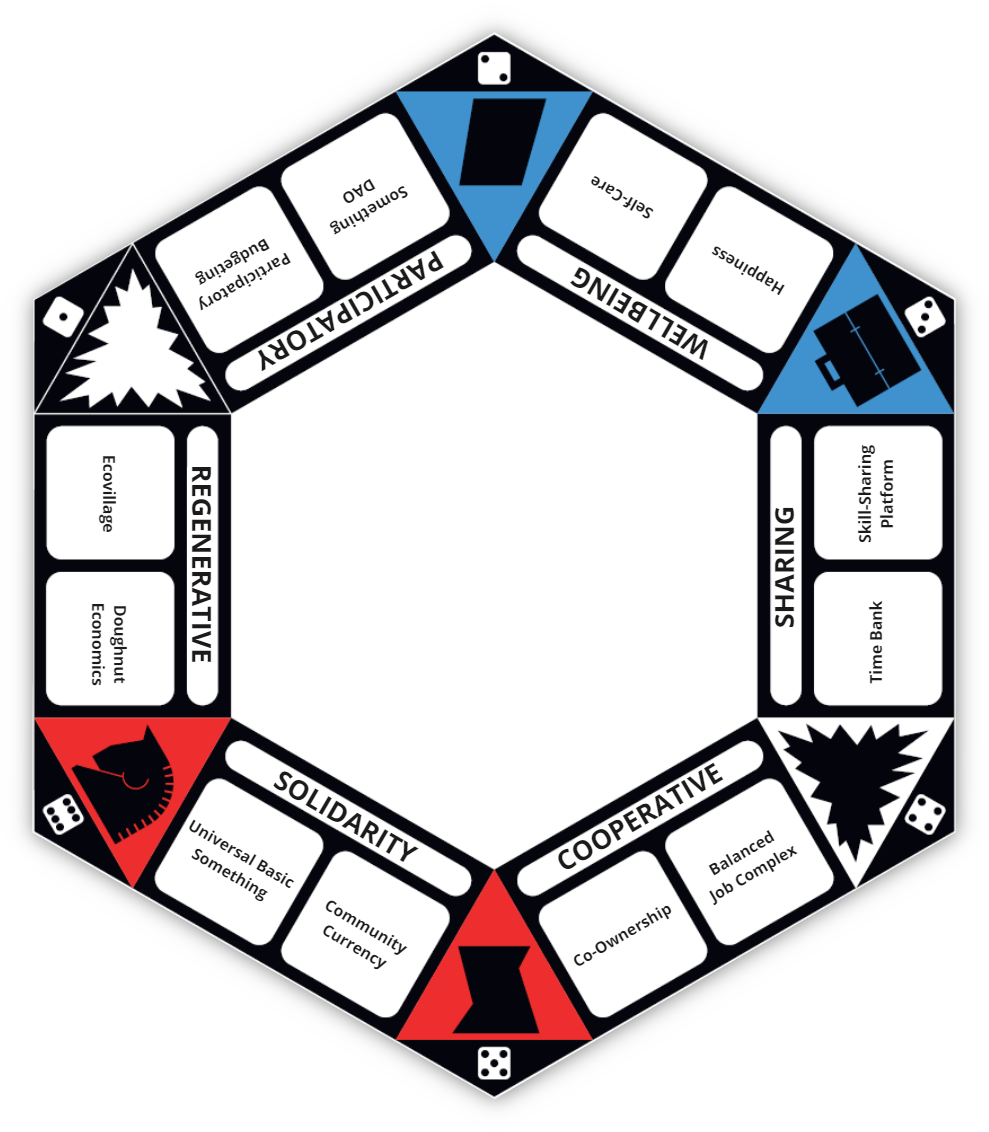 The main idea behind the game is that we all participate in and craft this thing together. So today, you are not passive audience members, you are “peerticipants”, who will be able to influence the game in a number of ways; more on how in a bit. Throughout the game, two teams – Capitalism and Commonism – will, with their narrative strategies and powers of persuasion, attempt to co-opt or otherwise win onto their side an array of buzzwords associated with alternative economies and/or governance. What we have for this edition are sharing, wellbeing, participatory, regenerative, solidarity, and cooperative. We've decided on these, among many other possibilities, together with the players, and came up with two active playing fields for each. Let’s say these are representative alternative economy practices, models or concepts. Around these, in a few moments there will take place a discursive battle for your hearts and minds. While the Capitalists will be invoking different kinds of challenges in order to co-opt these contested alternative economic spaces or “ideological battlegrounds”, the Commonists will be manifesting different kinds of interventions for radical transformative change.